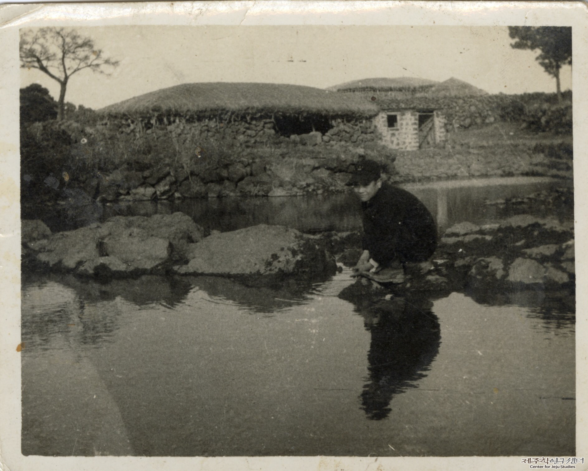 김원출 씨 남동생이 중학생 시절 수산리 당동에 있는 연못 돌담에 앉아 찍은 사진이다. 인물 뒤로는 옛 전통 초가 모습과 '주젱이(주지)'를 씌운 '눌(가리)'와 촘촘히 쌓아올린 돌담 등이 보인다. 당시 당동 연못은 마을 주민이 기르던 소가 물을 먹던 곳으로 이용되었지만 어느 날 매립됐다고 한다.