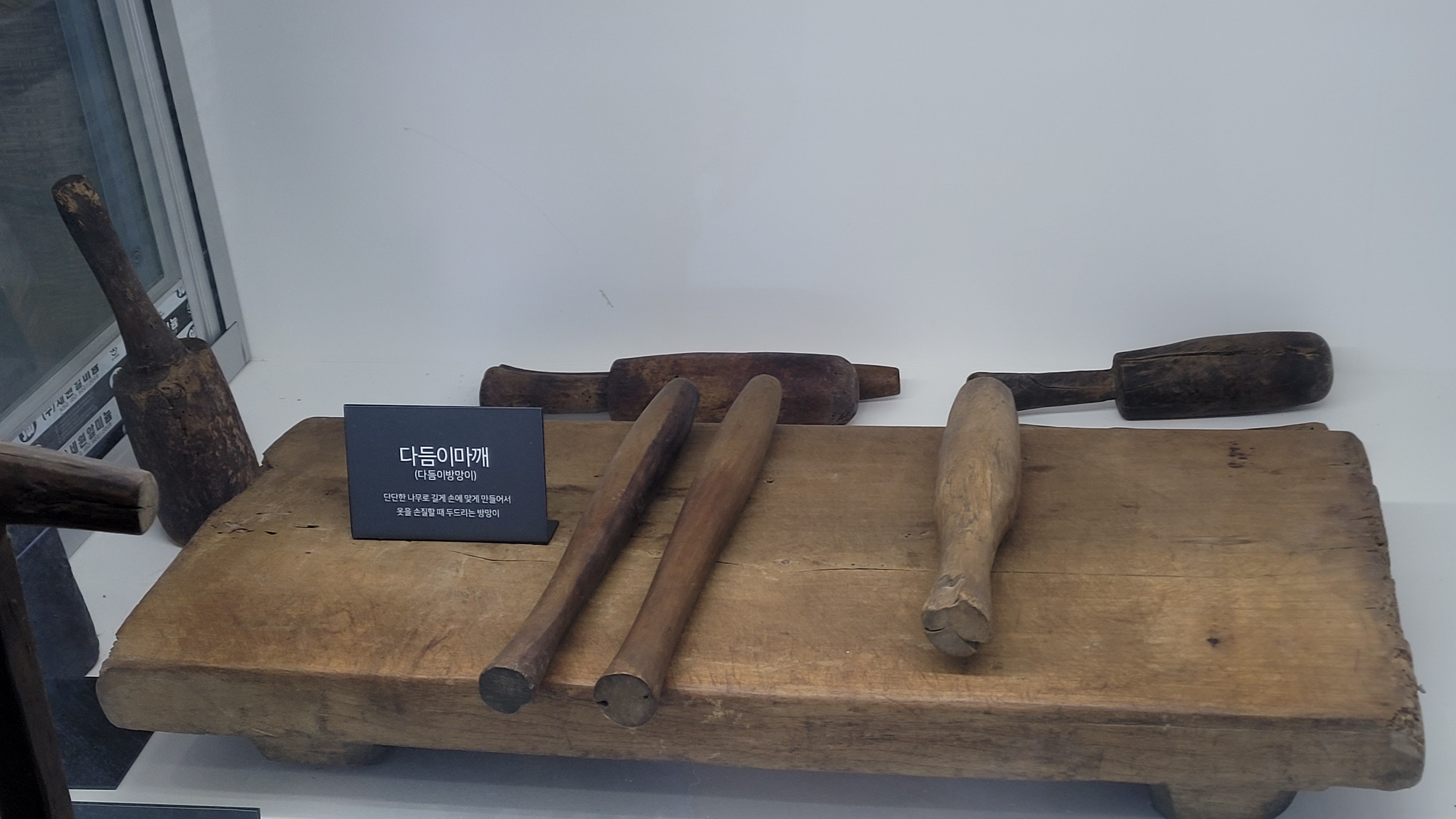 -자료 설명: 안덕면 감산리 김유헌 씨가 감산 작은 박물관에 기증한 '다듬이마께(다듬잇방망이)'와 '안반'이다. '다듬이마께'는 다듬이질을 할 때 쓰는 방망이다. 두 개가 한 쌍이 되도록 나무를 다듬어 만들었다. 한편, '안반'은 옷감을 손질할 때 쓰는 두껍고 넓은 나무판이다.