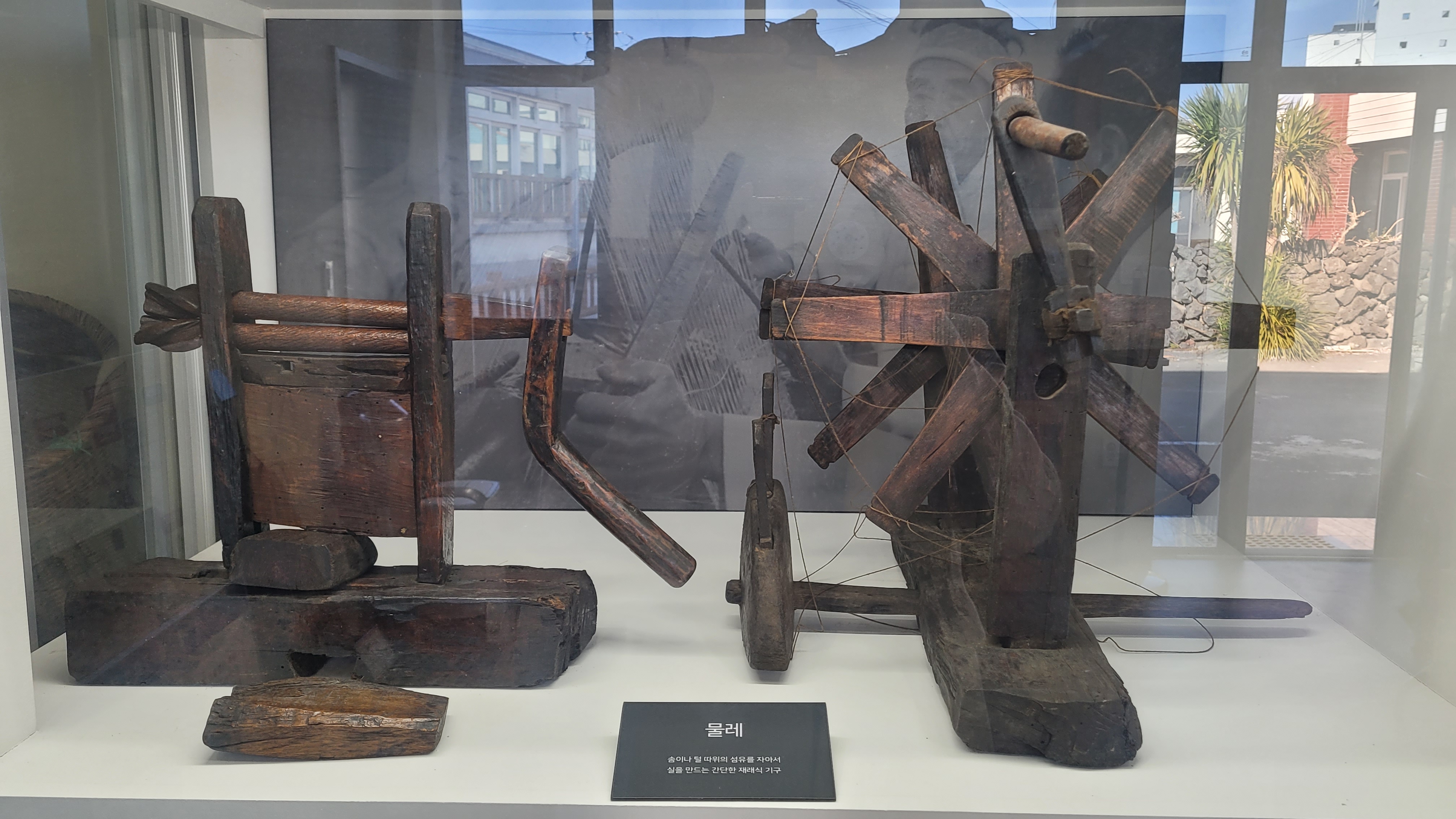 -자료 설명: 안덕면 감산리 김유헌 씨가 감산 작은 박물관에 기증한 'ᄇᆞ르는물레(씨아)'와 'ᄌᆞᆺ는물레(물레)'이다. 사진 왼편에 있는 물레는 'ᄇᆞ르는물레'로 목화의 씨를 빼는 기구다. 한편 오른쪽에 있는 물레는 ​'ᄌᆞᆺ는물레(물레)'로 솜 따위의 섬유를 자아서 실을 만드는 재래식 기구다.