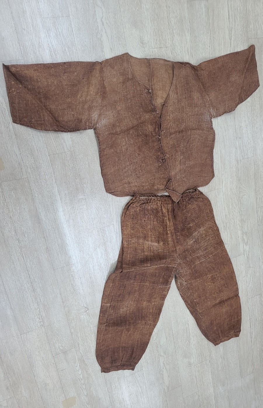 -자료 설명: 한림읍 명월리 양순자 씨 소장 '갈적삼'과 '갈몸뻬'다. '갈몸뻬'는 2021년도에 양순자 씨가 직접 감물을 들여 만들었다. 본래 옷감은 모시로 감물을 들여 여름철 동안 입는다고 한다.