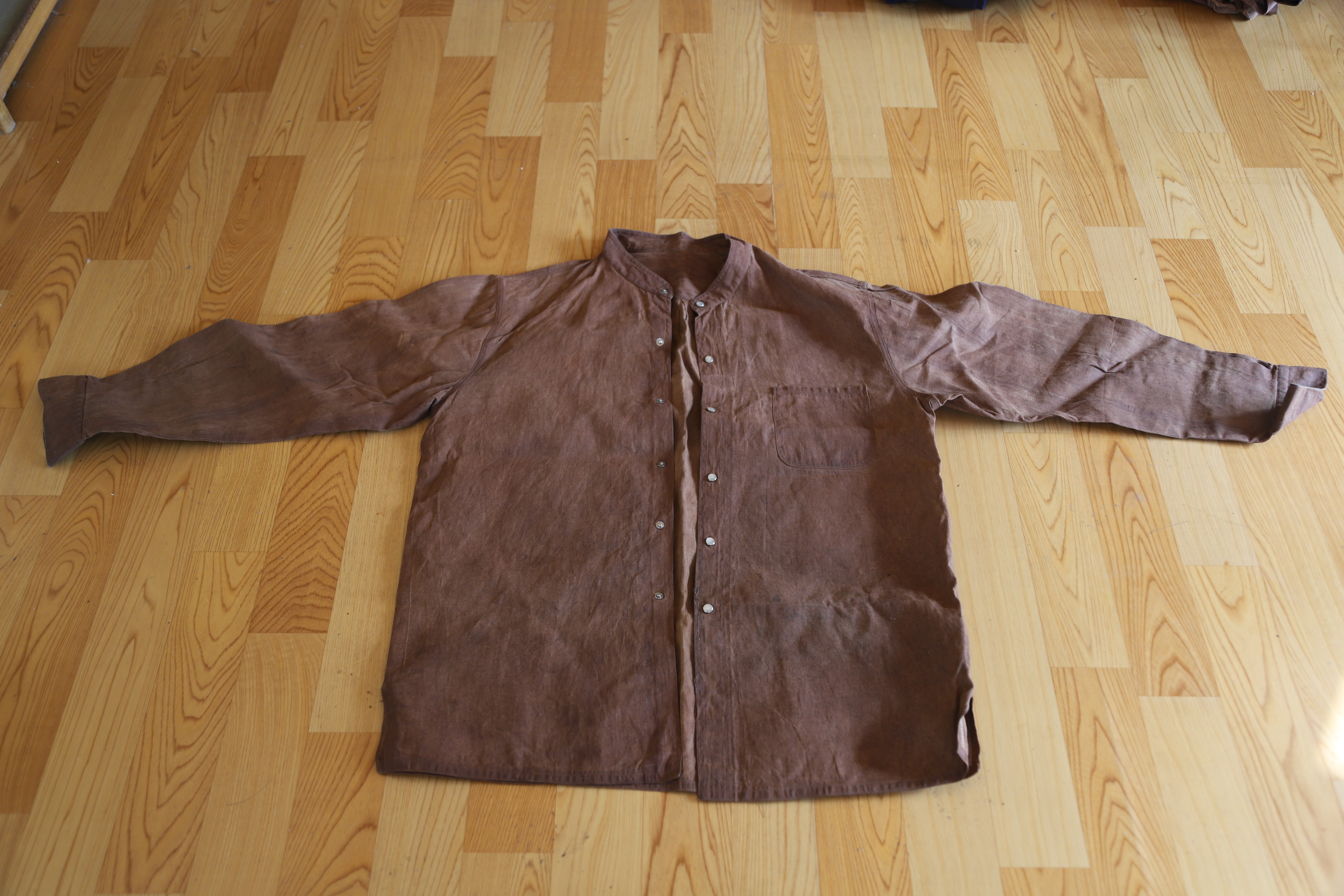 4) 설명: 차이나카라 셔츠에 감물을 들인 남성 상의임. 여밈 부분에 은색 똑딱이단추 6개가 달렸고, 왼쪽 가슴팍에 주머니를 덧대었음.
