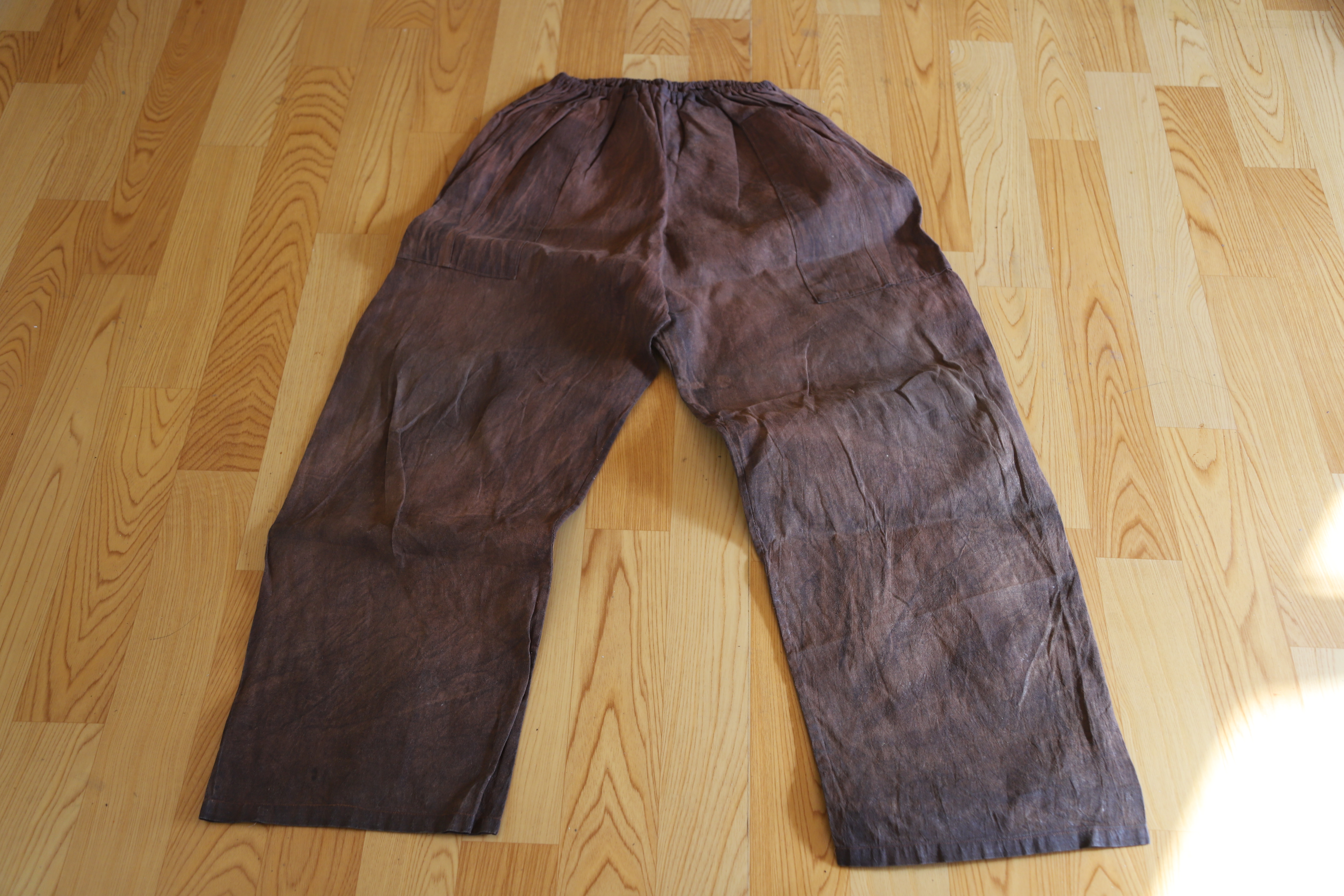 4) 설명: 감물로 염색한 하의임. 노동복으로 착용하였음. 허리에는 고무줄이 넣어져 있음. 바지 부리로 갈수록 통이 넓어짐. 바지 양편에는 주머니가 덧대어짐. 집안 남성이 벌초할 때 주로 착용했다고 함.