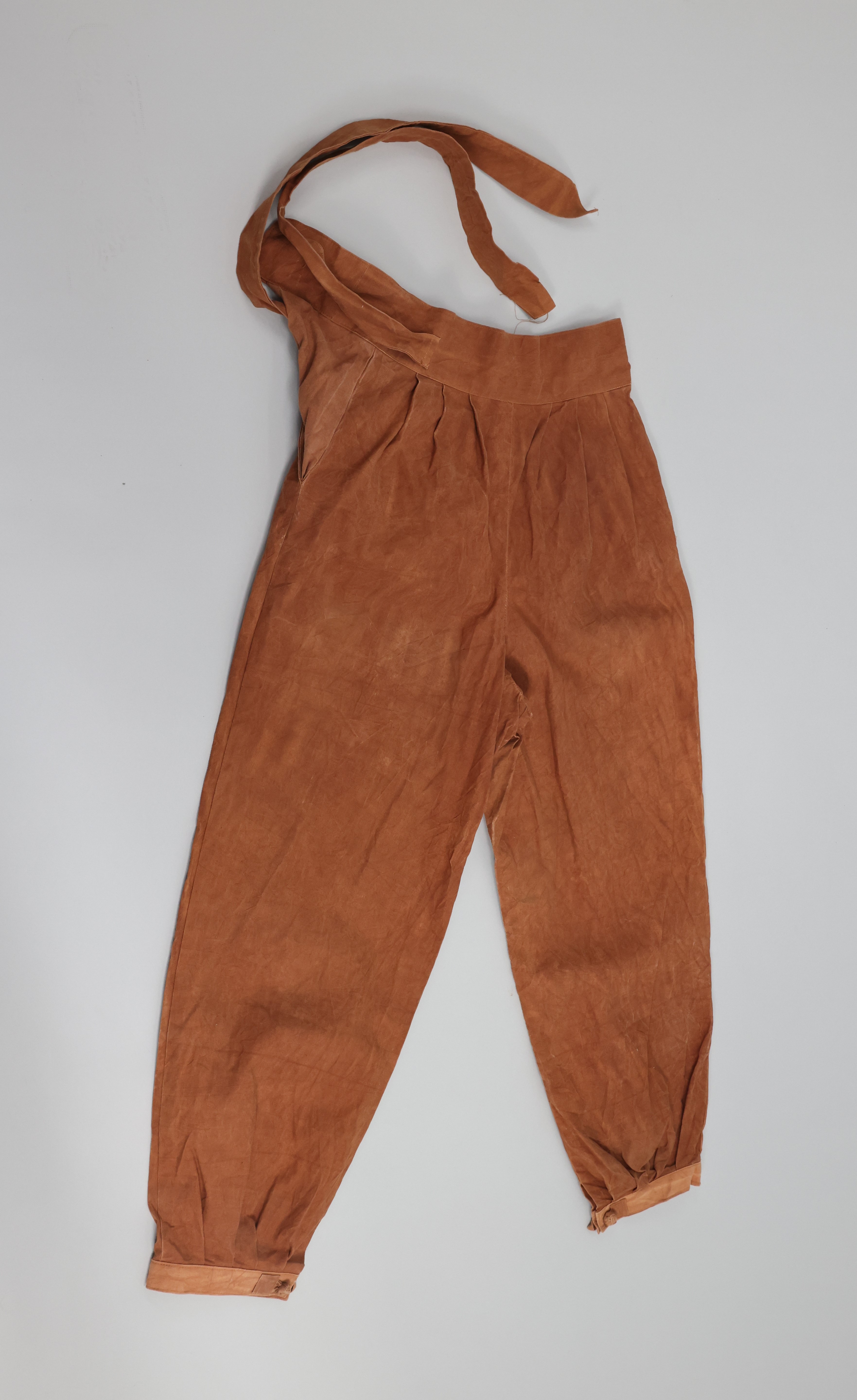 4) 설명: 감물을 들여 만든 여성용 하의임. 재질은 사직(면)으로 되어 있음. 허리에는 2개의 끈이 있고, 바지 부리에는 매듭단추가 달려 있음.