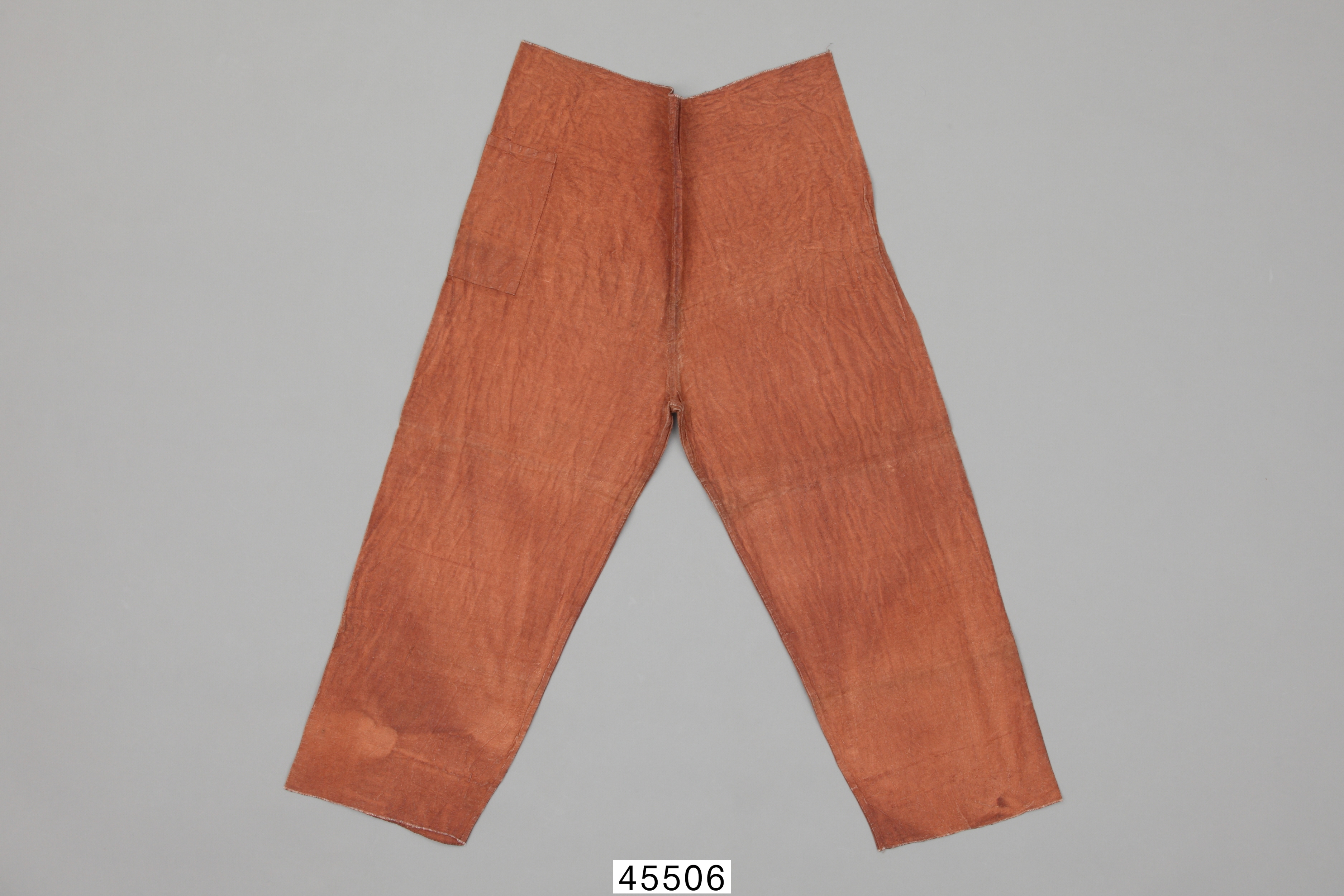 4) 설명: 감물을 들여 만든 남성 하의임. 홑옷으로 바지 부리로 갈수록 바지통의 폭이 좁아지는 형태임. 허리말기가 없음. 한쪽 허벅지 부분에 주머니가 달림.