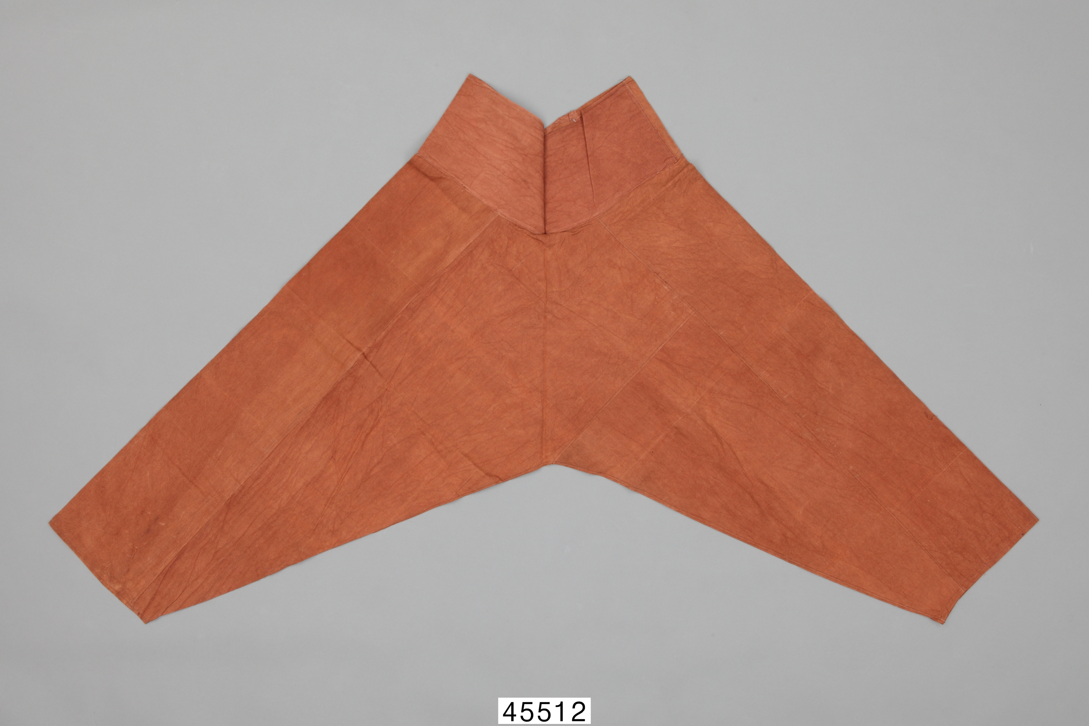 4) 설명: 감물을 들여 만든 남성 하의임. 홑옷으로 부리로 갈수록 바지통의 폭이 좁아지는 형태임.