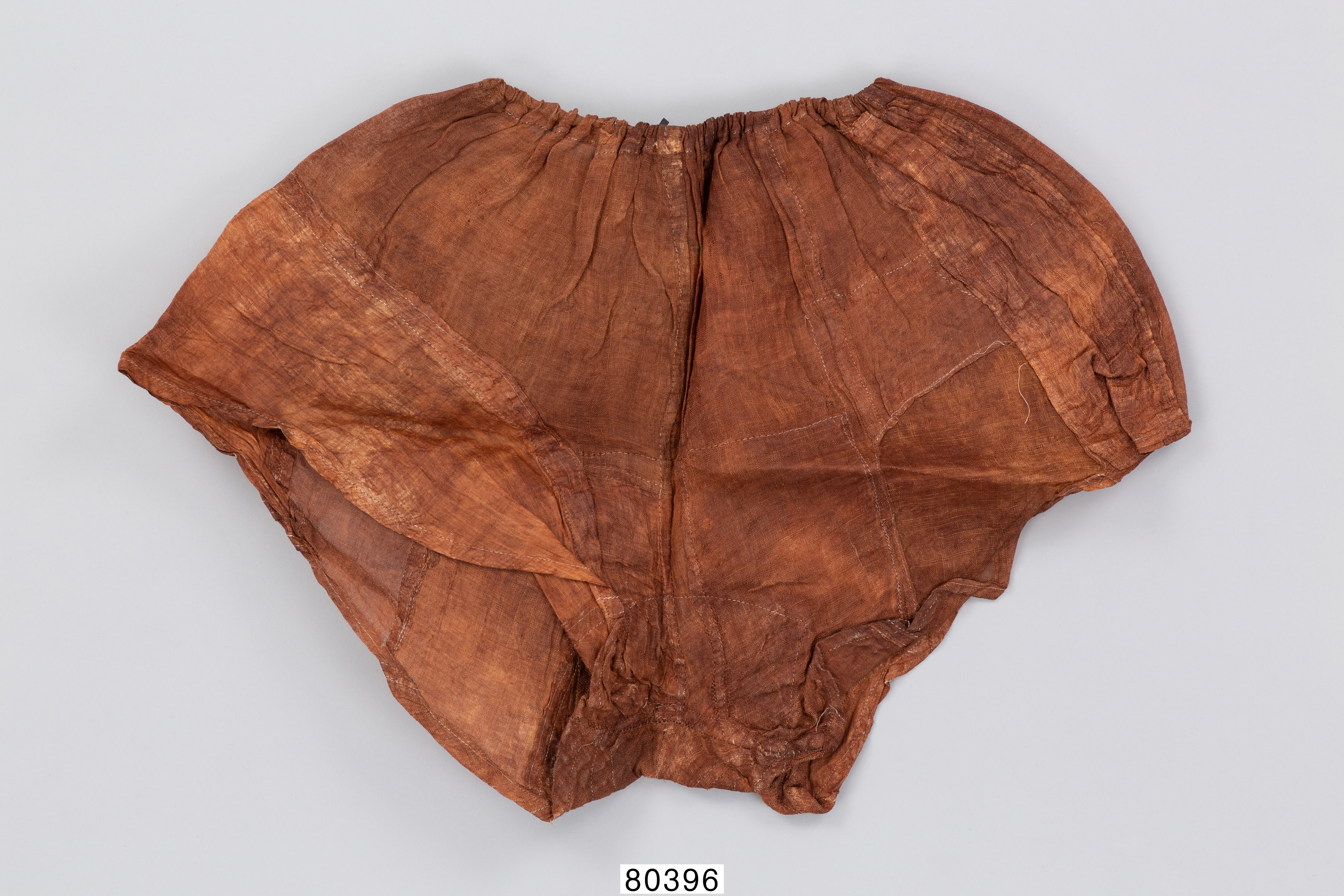 4) 설명: 감즙으로 염색해서 만든 여성용 내의(하의)임. 다리 부분은 없고 허리와 엉덩이가 몸에 맞게 만들었음. 조각천을 이어붙여 만들고 허리에 고무줄이 들어가 있음.