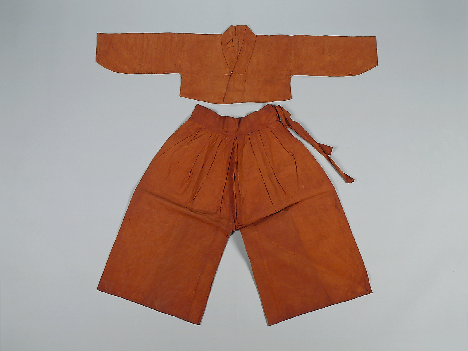 4) 설명: 상하의는 무명에 덜익은 감으로 염색한 갈옷임. 상의는 깃끝에 매듭단추와 고리가 부착되었고, 하의는 단속곳 형태로 끈 2개가 달려 있음. 삼각형 밑이 달림.