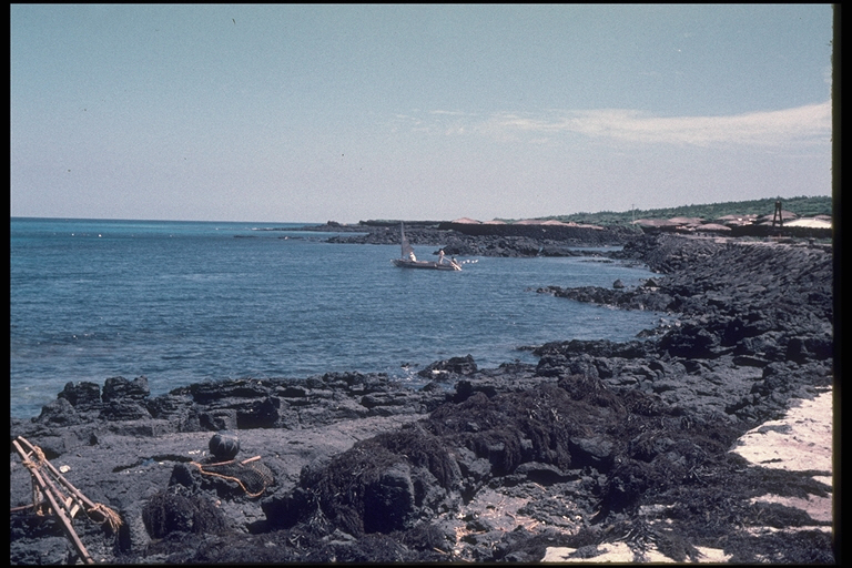 * 개요 : 검은 현무암이 뻗어 있는 해안가에는 해초들이 널려 있다. 마을 사람이 나무지게로 지고 와서 널어놓고 말리고 있는 듯하다. 바다에는 돛단배 한 대가 노를 저으며 나가고 있다. 뱃물질을 하는 해녀들을 태우는 돛단배인 것 같다. 해녀들이 물질작업을 하는 바다로 가고 있을 게다.
