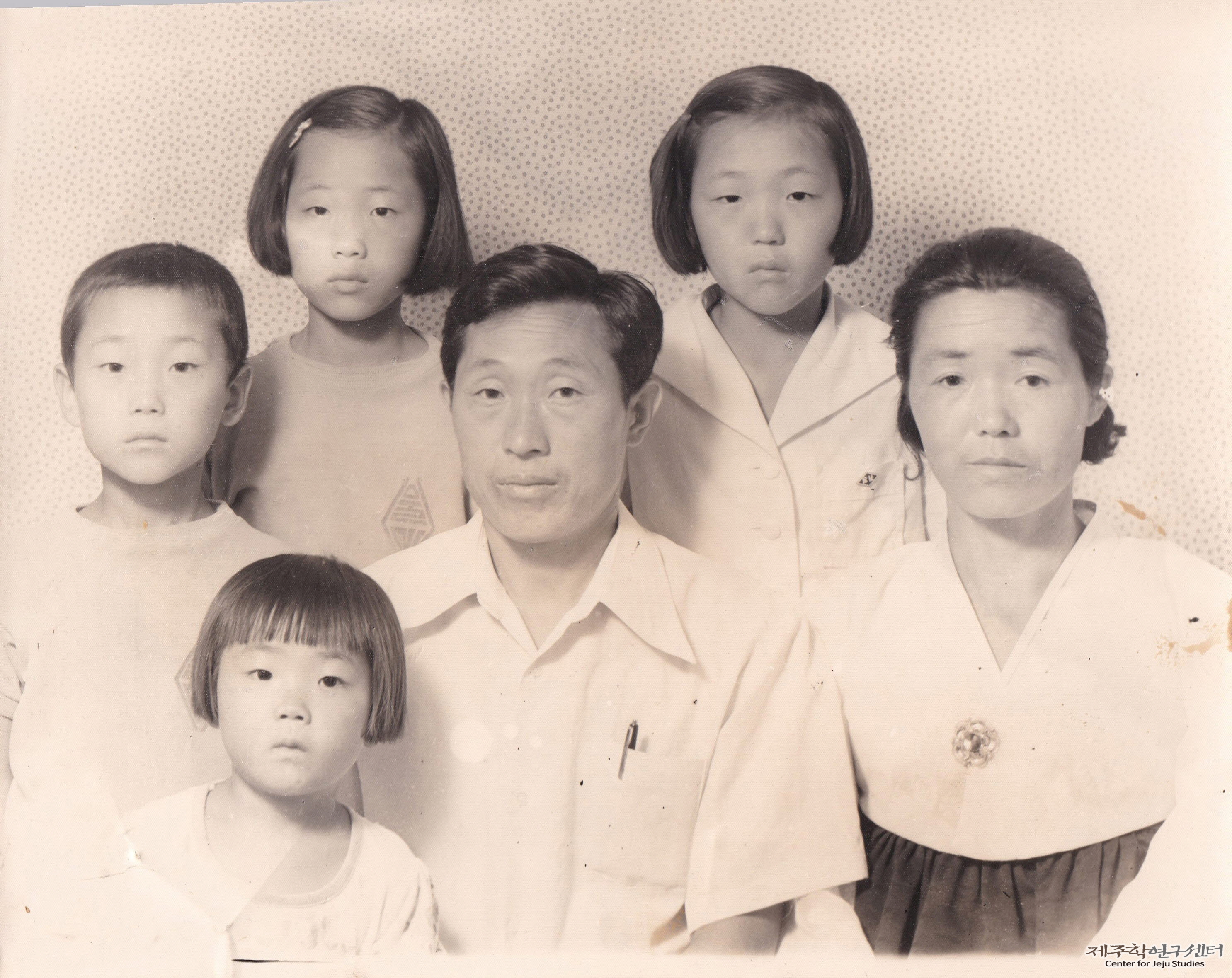 소장자 양용규 씨 큰딸이 제주여자상업고등학교(제주여상) 입학을 기념하여 제주시 서문통에 위치한 한 사진관에서 촬영한 사진이다. 앞줄엔 양용규 씨 부부와 자녀들이 함께하였다. 아내는 단정한 한복차림에 가슴 가운데 브로치를 착용하였고 부부 뒤로 제주여상 교복을 입은 큰딸이 서 있다. 양용규 씨 설명에 따르면 이 사진관은 애월읍 수산리 출신인 강 씨 성을 가진 분이 운영했다고 한다.