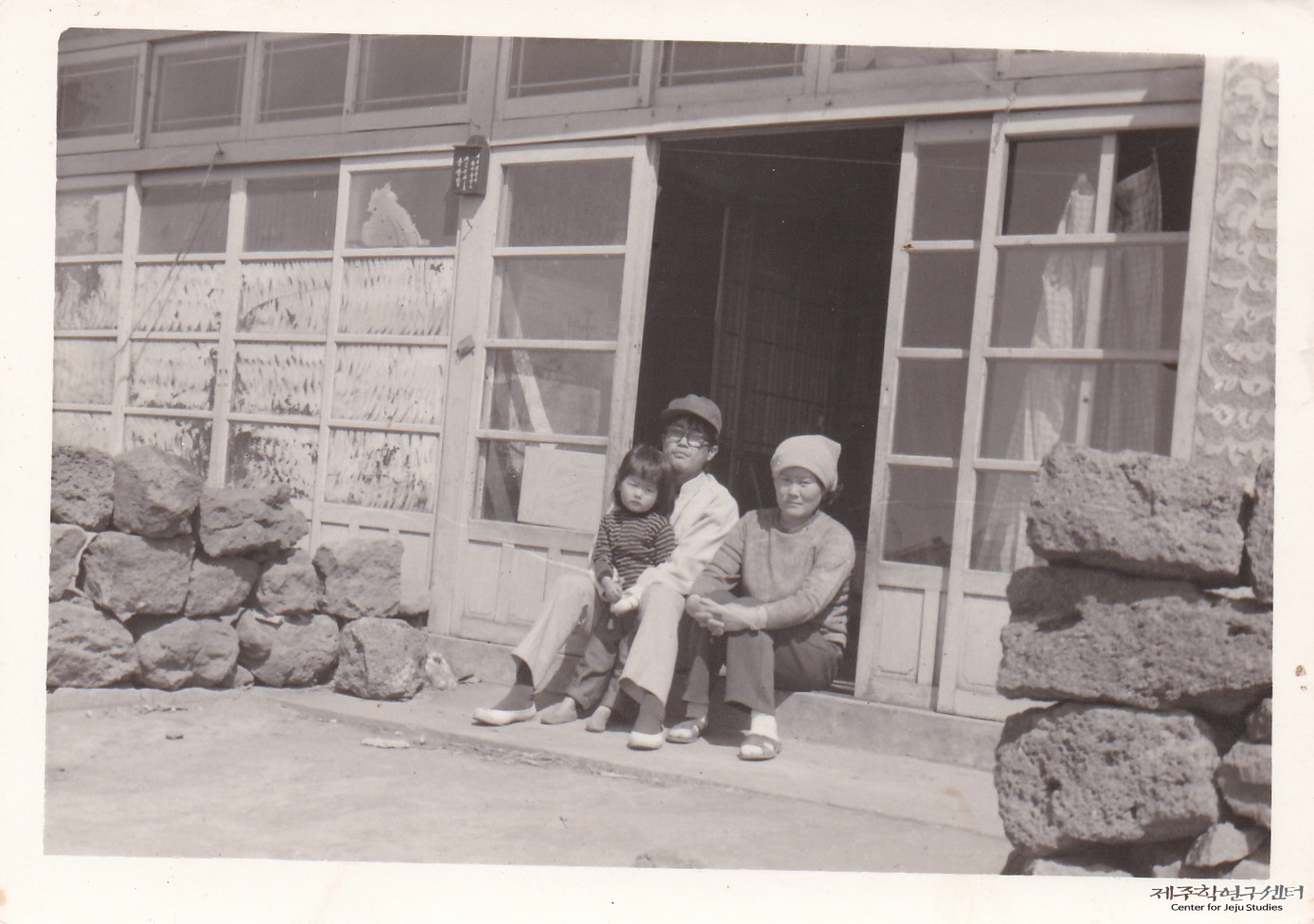 애월읍 수산리 윗동네 시댁에서 KBS 방송총국의 휴먼 다큐멘터리 <인간승리> 영상 촬영을 마친 후 집 '무뚱'에서 찍은 가족 기념 사진이다. 당시 <인간승리>는 1968년부터 1980년대까지 방영된 인기 다큐멘터리로, 역경을 딛고 일어선 지역 사회의 일꾼이나 헌신적인 인물을 그려낸 다큐멘터리라고 한다. 박송자 씨 남편도 전쟁 후유증을 앓았지만 적극적으로 새마을운동에 참여하는 등 마을 일을 돌보았다고 한다. 한편 뒤로 보이는 집은 1970년대 새마을운동 사업으로 옛 가옥을 보수하여 새로이 지은 것이라고 한다.